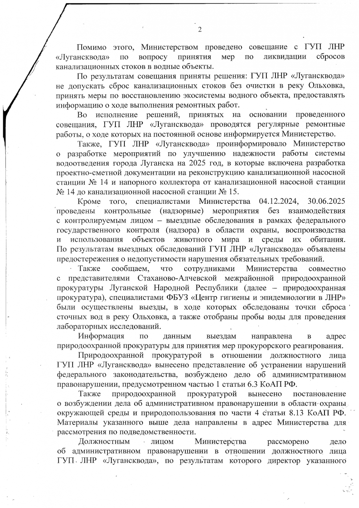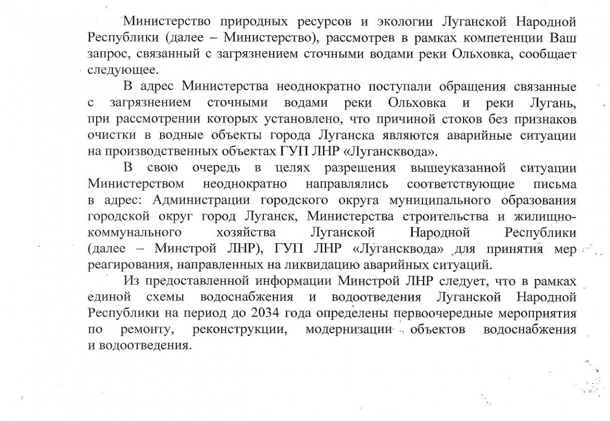 В свою очередь, Минстрой сообщил, что до 2034 года запланированы важные работы по ремонту, реконструкции и модернизации систем водоснабжения и канализации. Со специалистами «Луганскводы» проведено совещание, по результатам которого предприятие не должно допускать сброс канализационных стоков без очистки в реку Ольховка. При этом «Лугансквода» должна заняться восстановлением экосистемы водоема и сообщать о том, как идут ремонтные работы.