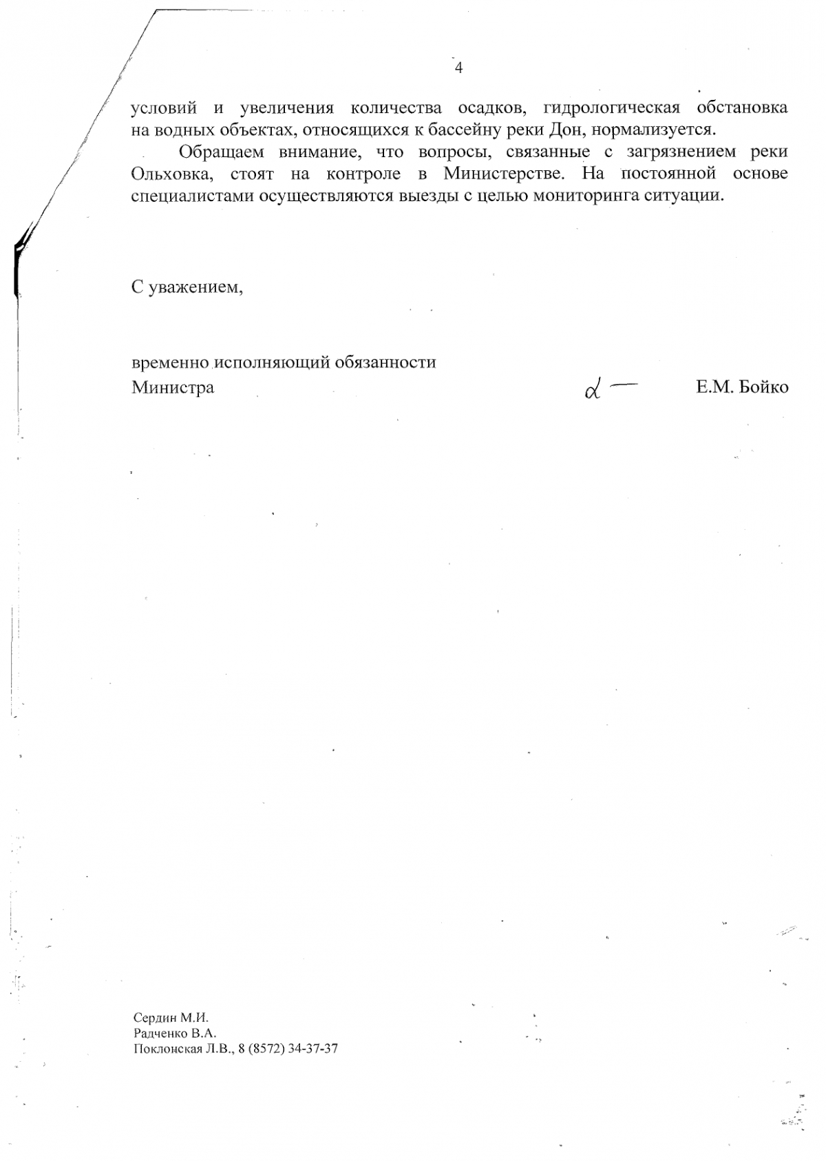 Сотрудники Минприроды вместе со Стаханово-Алчевской природоохранной прокуратурой и специалистами Центра гигиены и эпидемиологии в ЛНР обследовали места сброса сточных вод в реку и взяли пробы воды для анализа. Полученная информация передана в природоохранную прокуратуру для принятия мер. В отношении директора ГУП ЛНР «Лугансквода» прокуратура вынесла представление об устранении нарушений и возбудила два дела об административных правонарушениях: