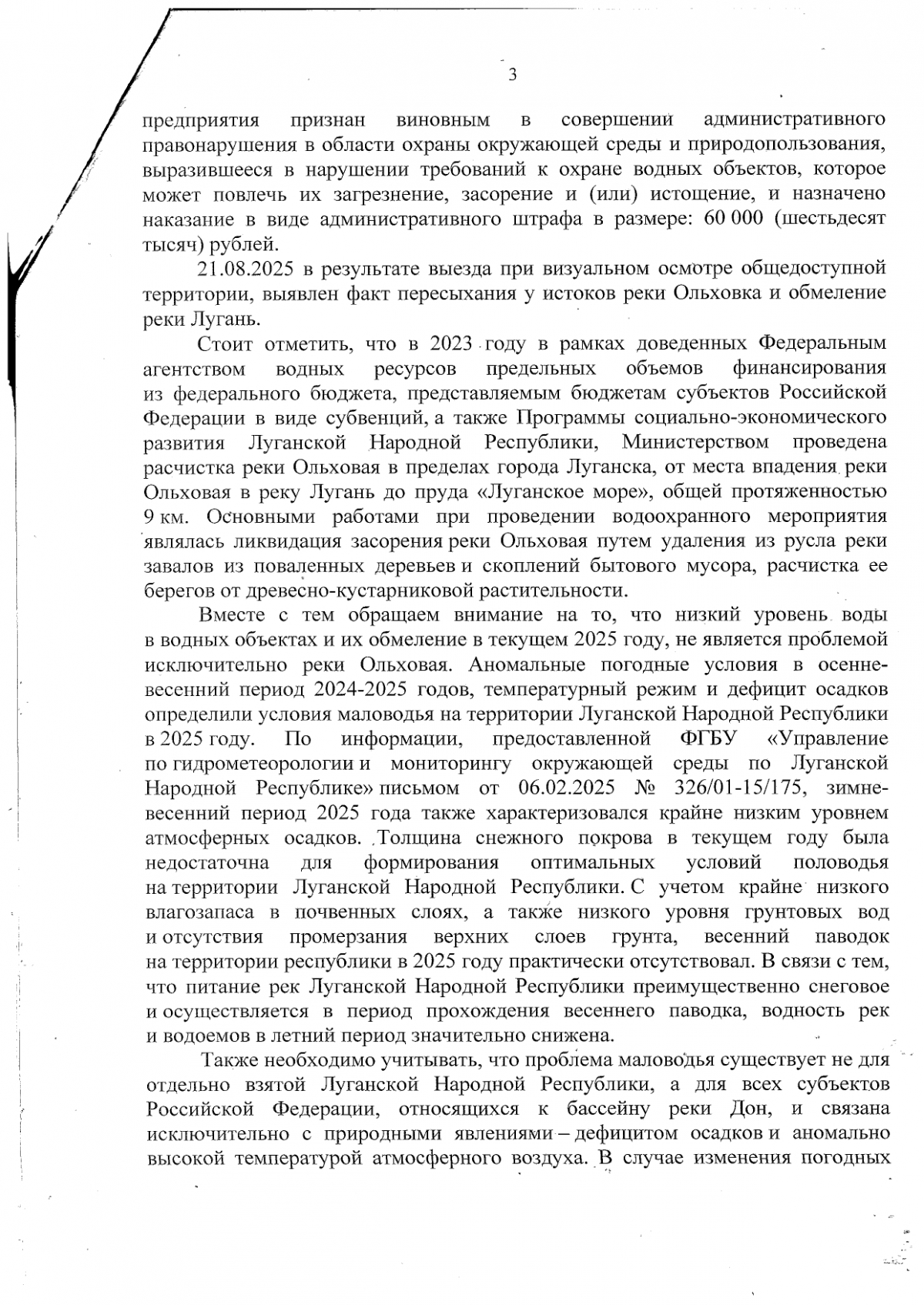 Специалисты Министерства также проводили плановые проверки 4 декабря 2024 года и 30 июня 2025 года – выездные обследования без взаимодействия с ГУП ЛНР «Лугансквода». Проверки касались охраны и использования объектов животного мира. В итоге «Лугансквода» получила предупреждения о необходимости соблюдать обязательные требования.