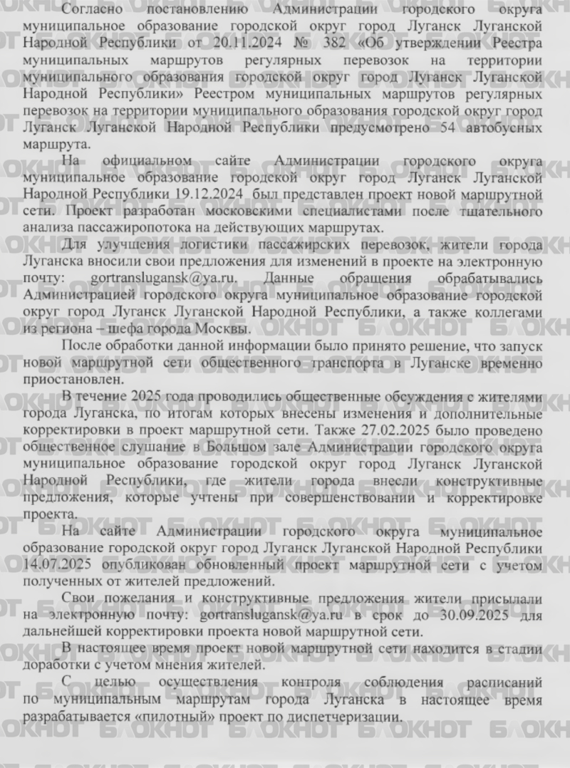 «В настоящее время проект новой маршрутной сети находится в стадии доработки с учетом мнения жителей», – проинформировали в Минтрансе ЛНР.