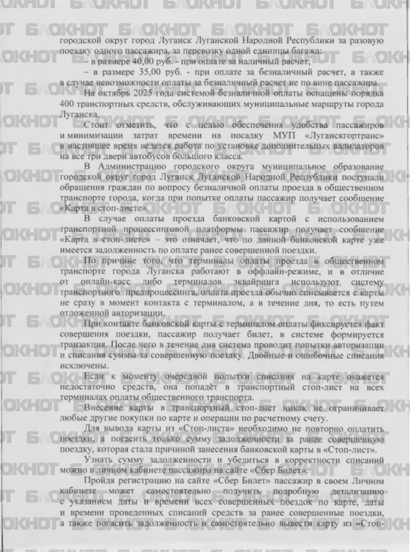 В Минтрансе ЛНР отметили, что основной причиной жалоб является проблема, связанная с «картой в стоп-листе». Сообщение означает, что у человека имеется задолженность по оплате ранее совершённой поездки.