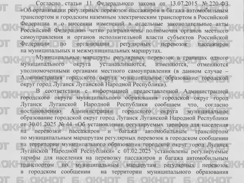 С 1 февраля установлены новые тарифы для Луганска на перевозку пассажиров и багажа автотранспортом: 40 рублей при оплате наличными и 35 рублей при оплате безналичным расчётом, а также в случае, если нет возможности оплатить безналичным расчётом не по вине пассажира.