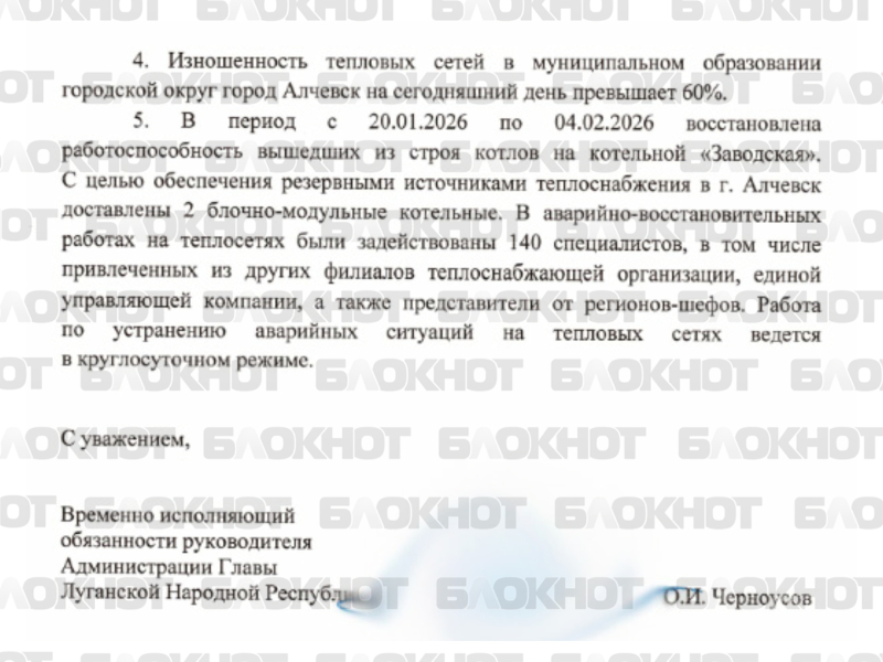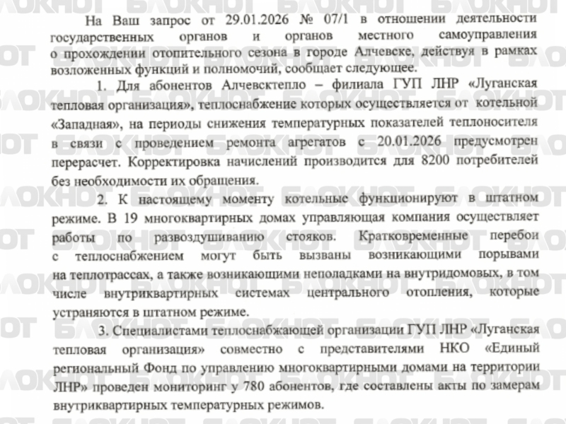 Редакция «Блокнот Луганск» выяснила, что перерасчёт всё-таки будет. Для 8 тысяч абонентов-потребителей тепла от котельной «Западная» на периоды снижения температуры в помещениях предусмотрен перерасчёт платежей. Как отметили в Правительстве ЛНР, лично обращаться в теплоснабжающую организацию не нужно – всё произведут автоматически.