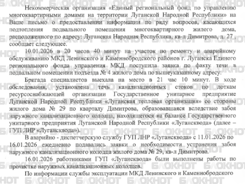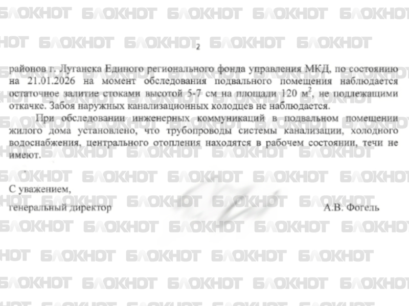 «По информации службы эксплуатации МКД Ленинского и Каменнобродского районов города Луганска Единого регионального фонда управления МКД, по состоянию на 21.01.2026 на момент обследования подвального помещения наблюдается остаточное залитие стоками высотой 5-7 сантиметров на площади 120 квадратных метров, не подлежащими откачке», – констатируют в управляющей компании.