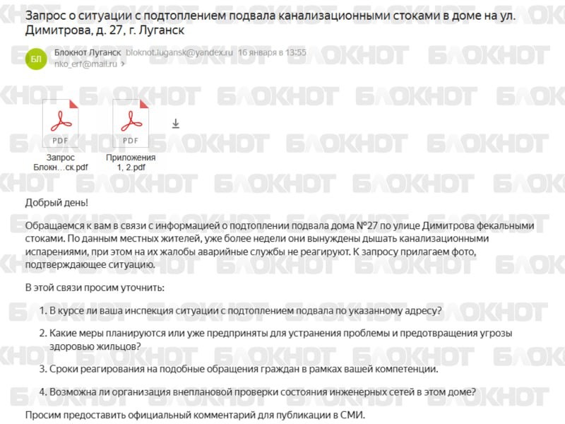 Ранее "Блокнот Луганск" писал, что на Димитрова в Луганске подвал затапливает фекалиями. Мы подготовили запрос в Жилстройнадзор ЛНР, но чиновники упорно не хотят регистрировать обращение, ссылаясь на неправильное оформление бумаги.