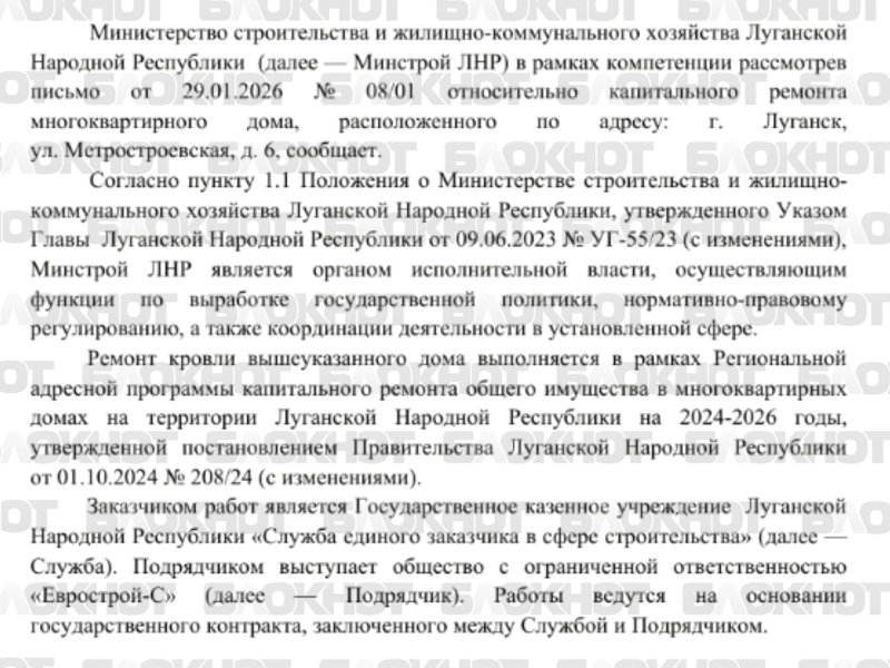 В ответе ведомства указано, что подрядчиком выступает «Еврострой-С», а ремонт кровли начат в июне 2025 года и до сих пор не завершён.