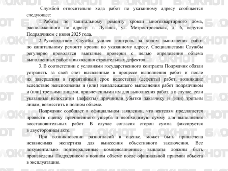 «При возникновении разногласий в оценке, может быть привлечена независимая экспертиза для вынесения объективного заключения», – уточнили в Минстрое ЛНР для «Блокнот Луганск».
